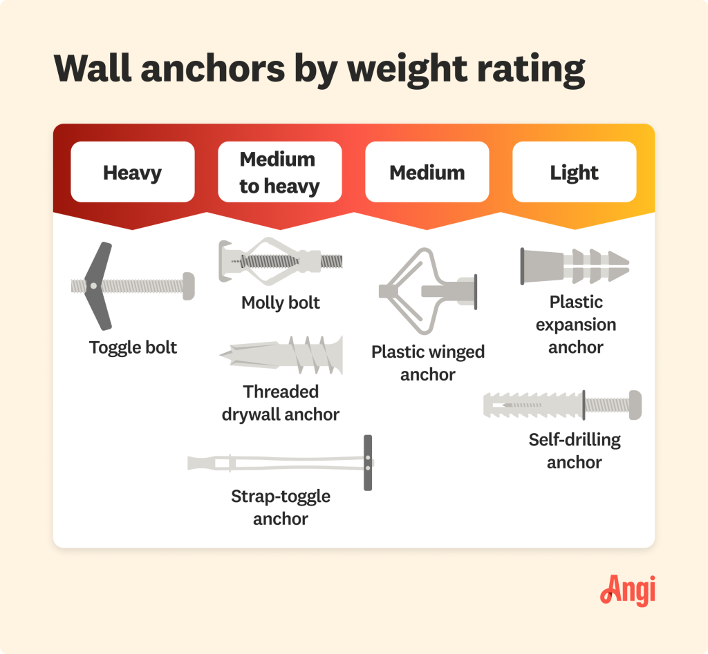 - Plastic anchors: best for standard drywall